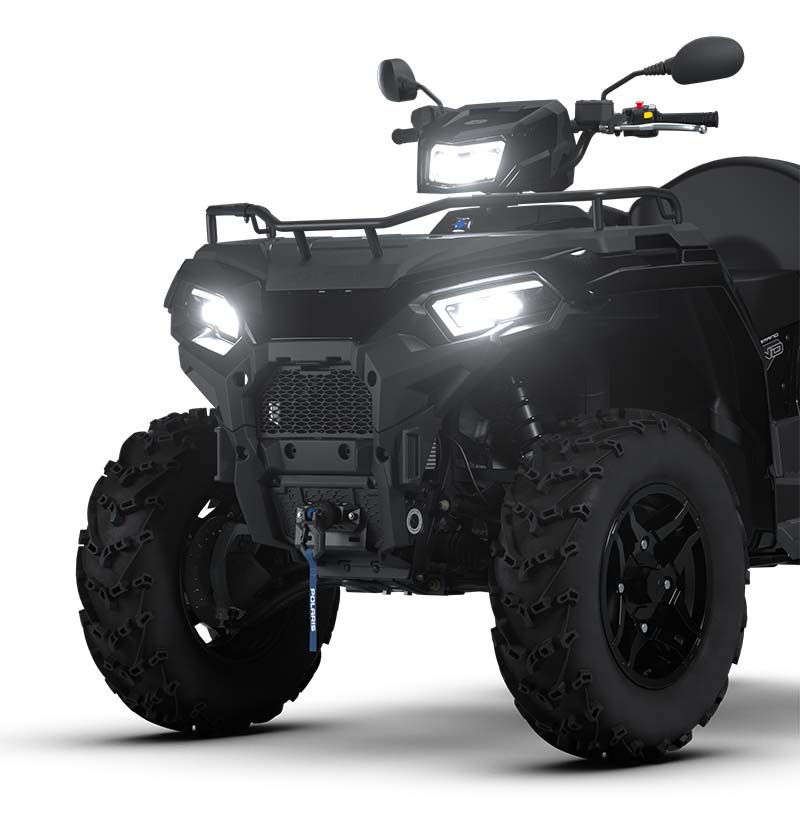 - 3 modes de conduite : Standard / Travail / Performance, Prise électrique 12 volts, port de charge lente intégré, pré-câblé pour chauffe-mains et chauffe-pouces, système de sécurité activé par code PIN, Treuil de 1 587kg (3 500 lb) avec corde synthétique et NOUVEAU système d'arrêt automatique, Rallonge de porte-bagages avant, benne basculante, protections de bras triangulaires avant et arrière, plastiques peints