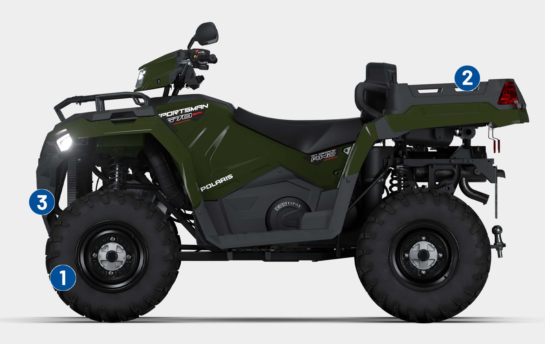 - Prise électrique 12 volts, port de charge lente intégré, pré-câblé pour chauffe-mains et chauffe-pouces, système de sécurité activé par code PIN, Rallonge de porte-bagages avant, benne basculante, protections de bras triangulaires avant et arrière